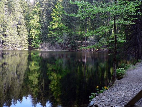 hráz Boubínského jezírka › stromy s chůdovými kořeny › Král smrků › Lovecká cesta › Lukenská cesta › Boubínské jezírko