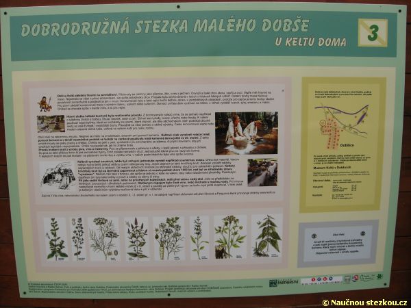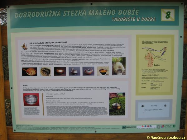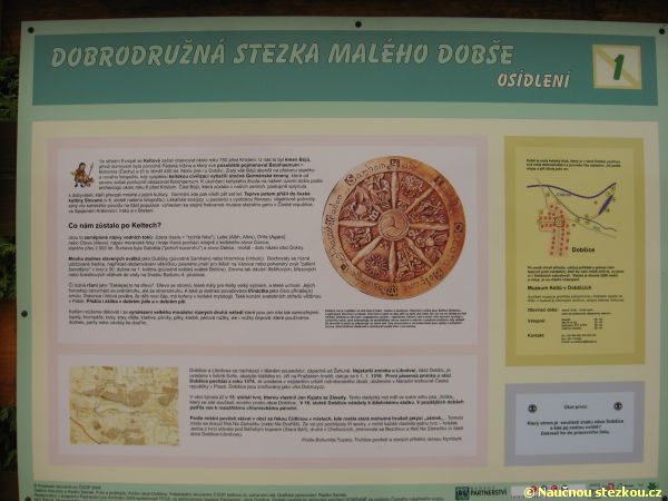 Naučná stezka pak pokračuje kolem řeky Cidliny a jejího slepého ramene až k tábořišti U Bobra u Steklé strouhy, odkud se vrací zpět do centra Dobšic. Průvodcem po naučné stezce je nám malý keltský kluk Dobš, který nás postupně seznamuje s místy v okolí Dobšic a jednotlivými součástmi keltského života.