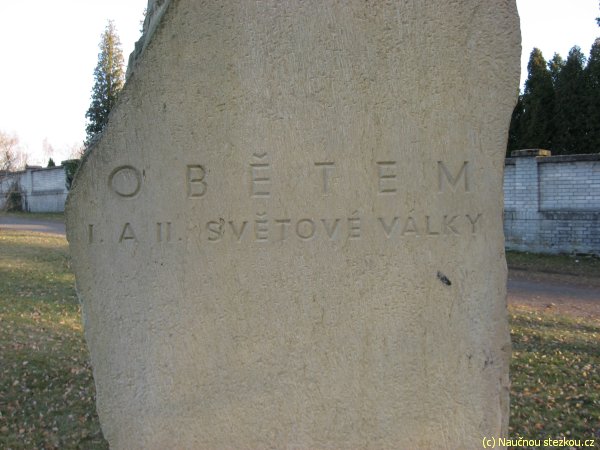 Na jejím konci zatáčíme vlevo březovou alejí směrem ke hřbitovu. Cestou potkáváme před kapličkou 13. zastávku (Alej ke hřbitovům), a při příchodu do prostoru před hřbitovy 14. a 15. zastávku (Bohdanečské hřbitovy, Památník obětem světových válek). Obě zastávky jsou sloučeny do jednoho informačního panelu. Památník se nachází na malém prostranství vpravo asi 40 metrů od cesty.