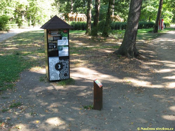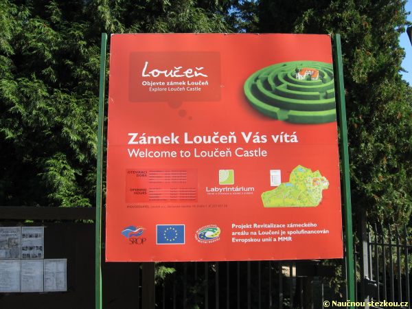 Labyrintárium Loučeň – informační panel první zastávky naučné stezky nás nedaleko vstupu do zámku láká k návštěvě