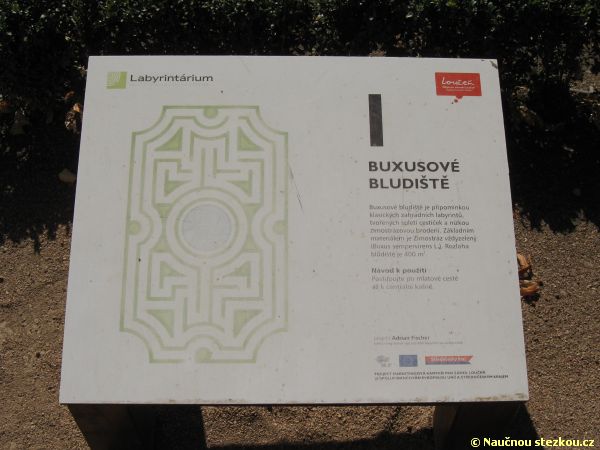 Labyrintárium Loučeň – informační panel u buxusového bludiště, jaké známe z barokních zahrad