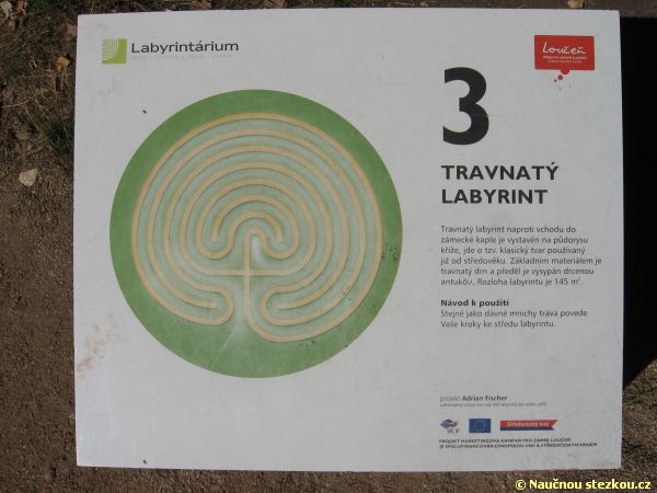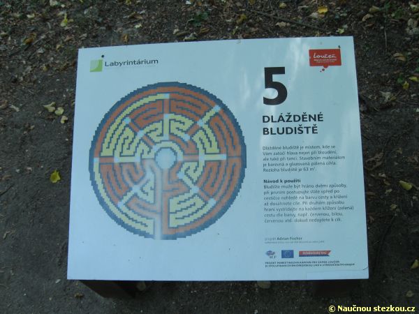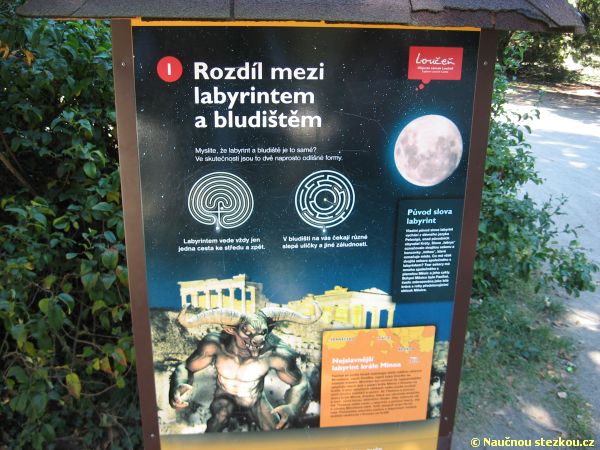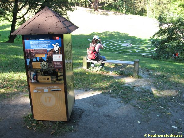 Labyrintárium Loučeň – šestá zastávka naučné stezky informuje o tom, kde se poprvé objevily kresby labyrintů