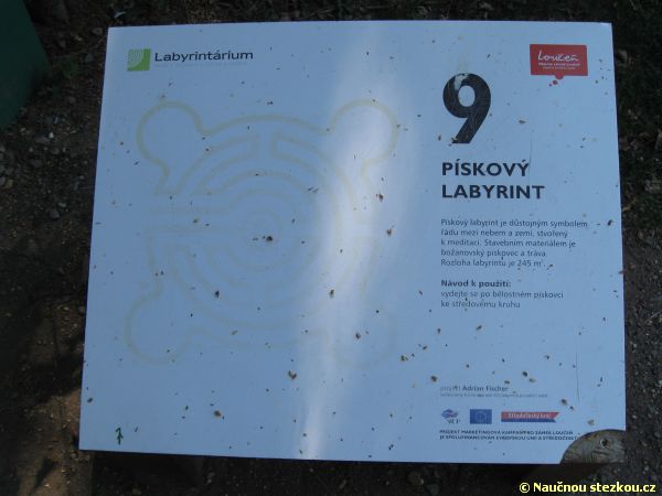 Labyrintárium Loučeň – informační panel u pískového labyrintu; jak název napovídá, je vystavěn z bílého pískovce